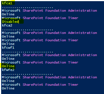 - From the out below, clearly we are seeing that SharePoint foundation Timer Job is disabled on kfca1, which is the problem.
