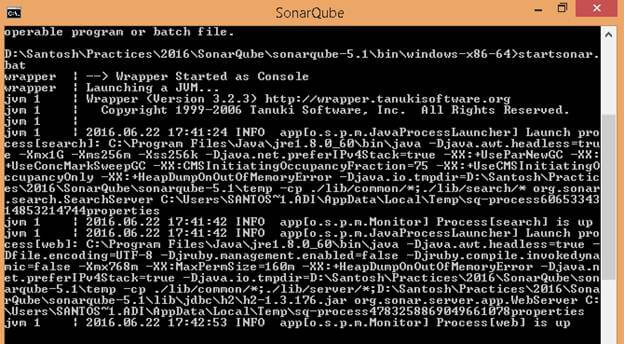Open a command Window and run D\Santosh\Practices\2016\SonarQube\sonarqube-5.1\bin\windows-x86-64\StartSonar.bat (or -x86-32 for 32-bit machines).