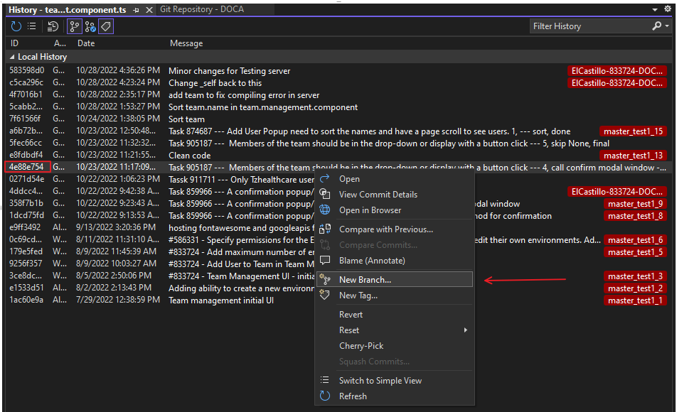 Use this way, we can create the new Branches, as many as we need, against each commit that we need to test: