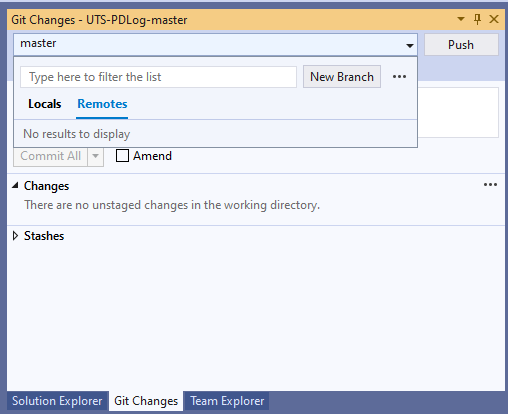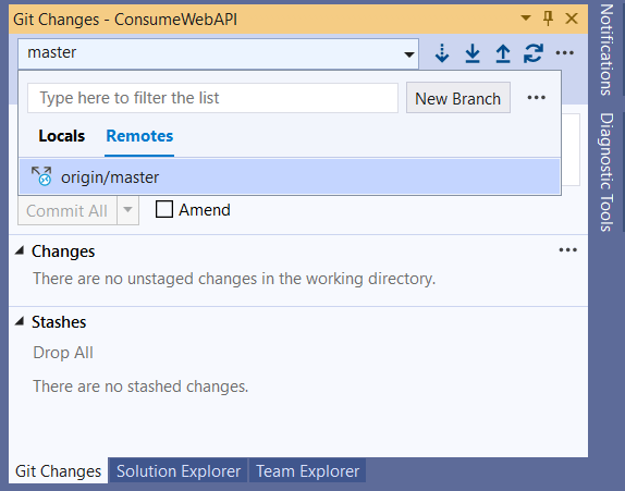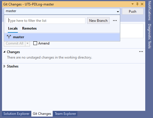 Examination the Git Changes window, we can see under locals, there is a master copy (called branch),