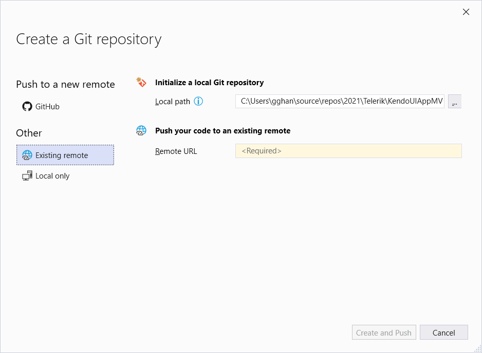 If we want to create a local repository in Git and push it into DevOps, then we should choose an Existing Remote like this: