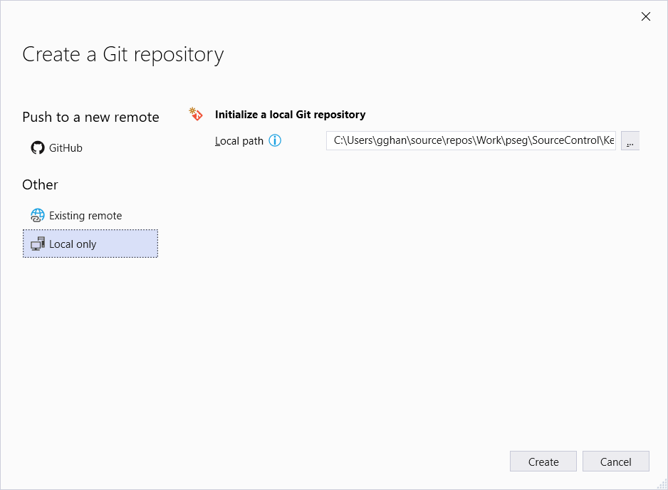 When choosing Local Only button in Create a Git Repository window, then Click Create Button, we create a local repository and save solution into it,