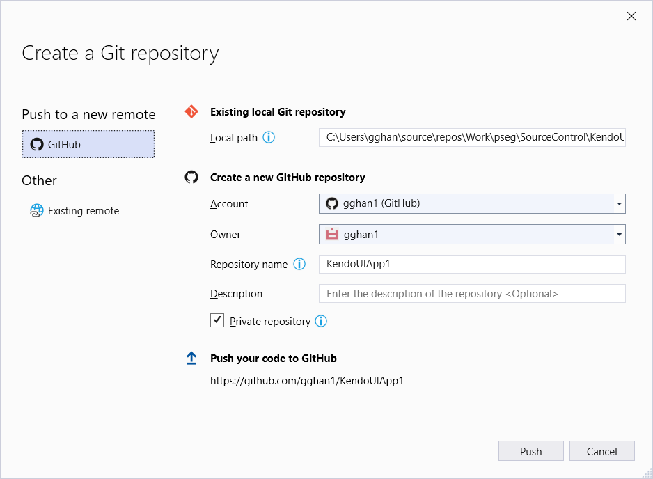 We can choose either the personal account or company account, and then click Create and Push button, we will create a local repository in Git, and push it into the server Git Hub. We will discuss the details later on in local.