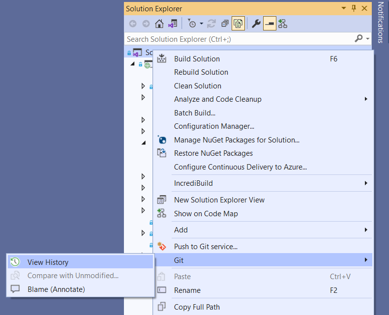 Right Click solution => Git => View History,