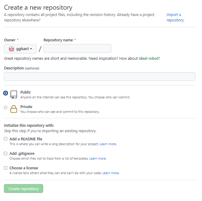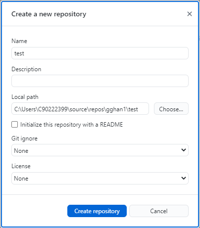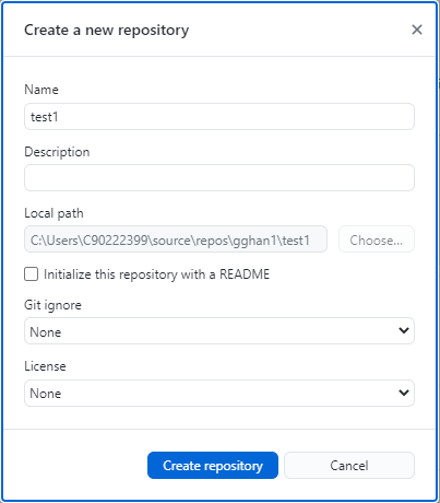 Either way will open a window: Create a new repository,