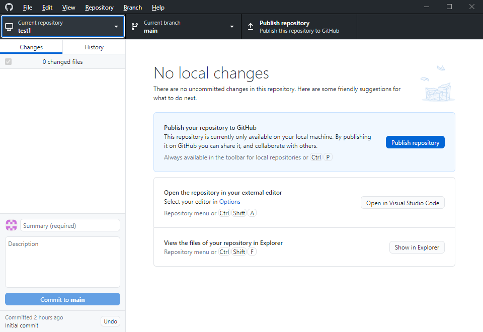 Now we created a local repository. Before we Click the button Publish repository in the window, we can view the local repository by Clicking buttons: Open in Visual Studio Code,