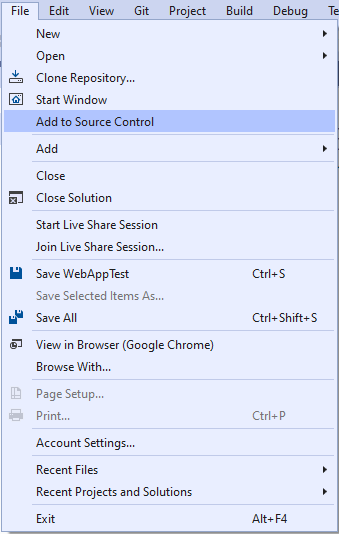 We want to add this project to Source Control. We have several ways (4 ways mentioned here) to initiate it in Visual Studio,