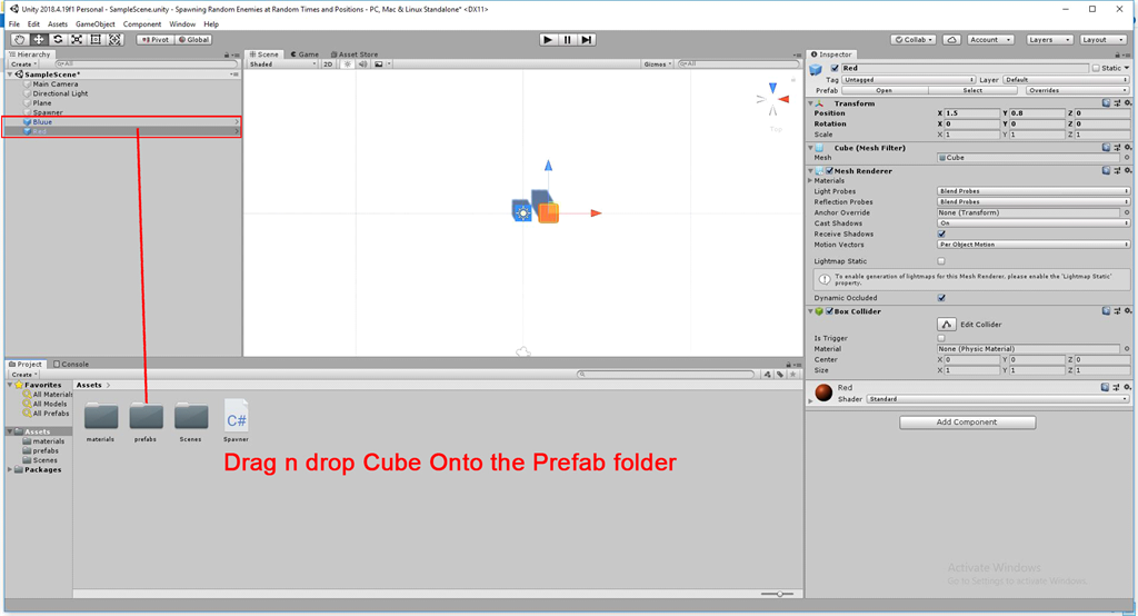 Drag and drop the blue and red cube onto the Prefabs Folder in Unity.