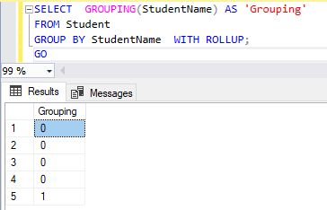 - SELECT GROUPING(StudentName) AS 'Grouping'