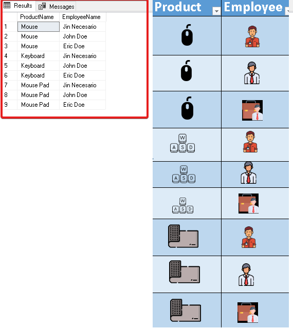 SELECT ProductName, EmployeeName FROM #EmployeesTemp CROSS JOIN #ProductsTemp