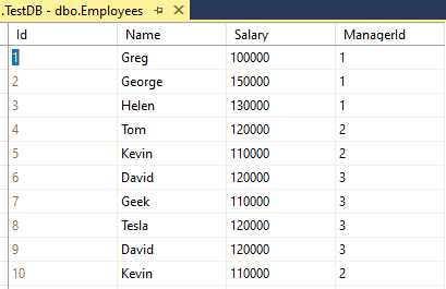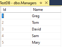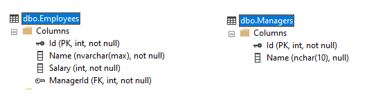 where, the ManagerId in Table Employees is a foreign key and point to the primary key, Id, in Table Managers.