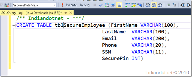 In the example, we use a new database, “SecureDataMask.” In this database, we are creating a tblSecureEmployee, as shown in the below figure.