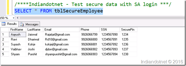 After our successful login, we will run the select statement on the same database table as we did earlier. If you see the below snap, you will find that we got masked data for LastName, Email, SSN, and securePin.