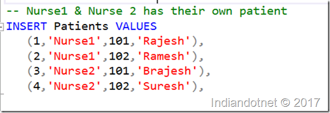 Now, running the same select statement but executing with “Nurse1” login, you will find 2 records that are relevant to Nurse1 visible.
