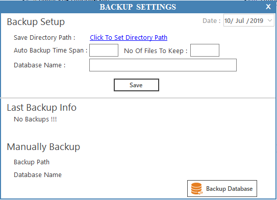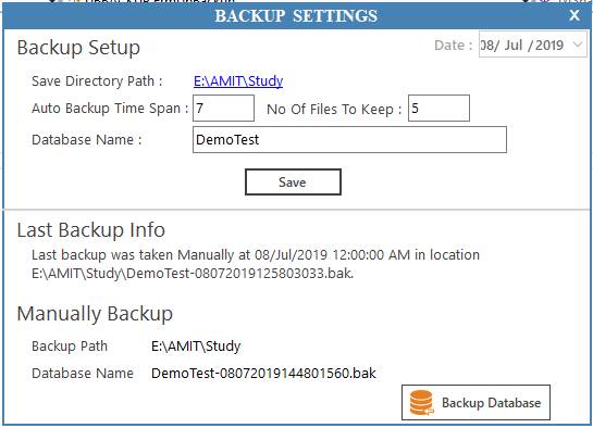 After save Backup Setup details you will see Backup Path and Database Name value is coming in Manually Backup section.