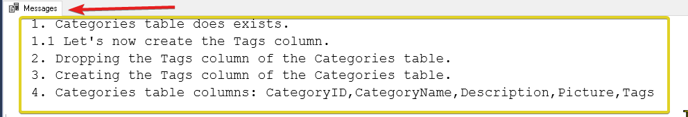 Going to the example above, as you can see, we have to check if the Categories table exists. Then from that, we did check if the Tags column does exist. If it does, we need to drop the existing column. And after that, we re-created the Tags column. Lastly, we have shown all the Categories-table columns by a comma-separated list.