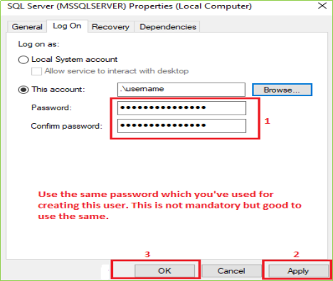 Note: Keep the user name & password the same for SQL Server service log on as Primary Server you’ve saved. And also make sure MSSQLSERVER & SQL Server Agent Service is running on your both server. For confirmation, you may restart these services in primary
