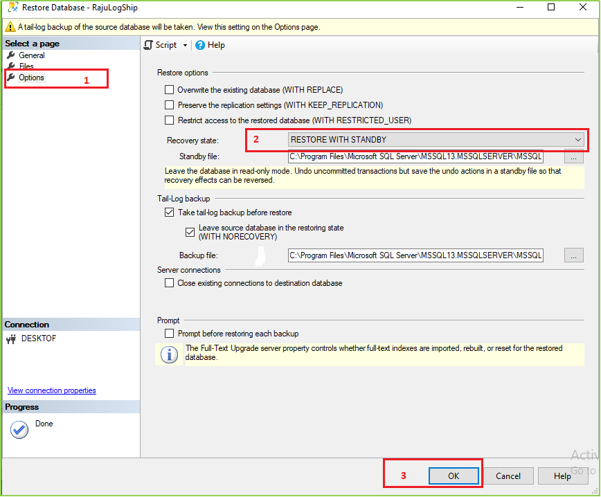 Now take a full backup of that database. And take the backup file to the secondary server & restore it as the following image. Here I’m not showing the full backup process but after selecting the database (.bak) file, you’ve to go Option > Then select “RESTORE WITH NORECOVERY”.