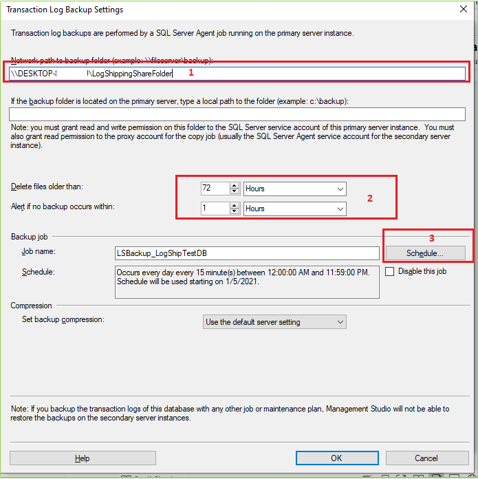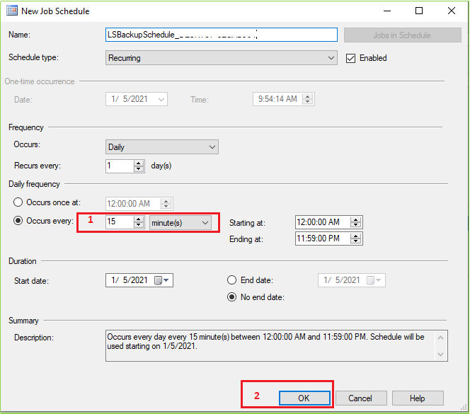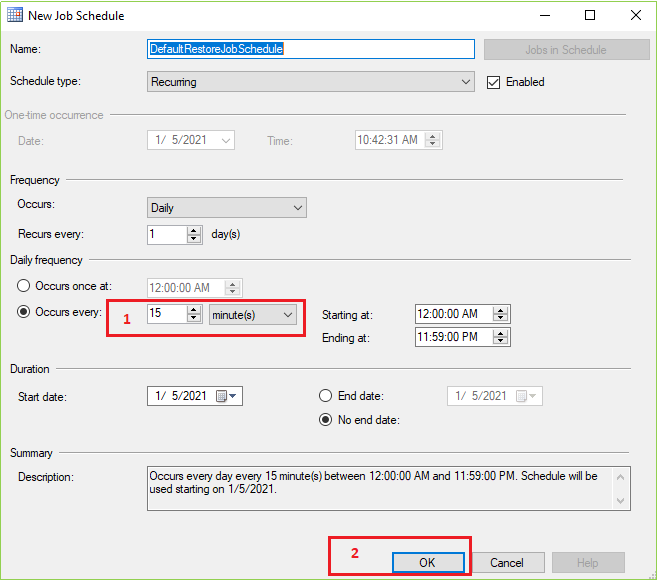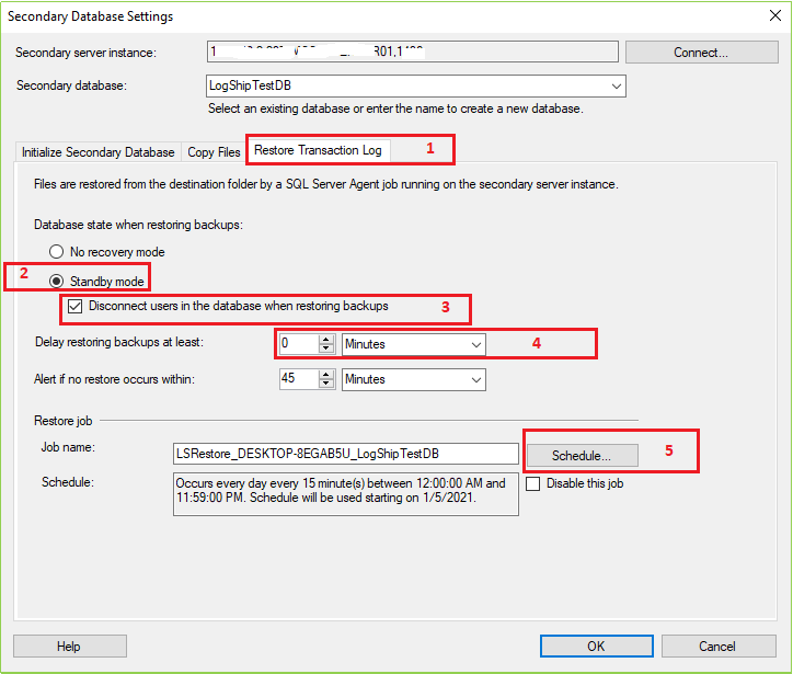 After clicking on Schedule… from the Restore Transaction Log tab following screen will appear. Change the marked field value as your requirement and leave others as usual if it is not necessary for you. Then click OK.