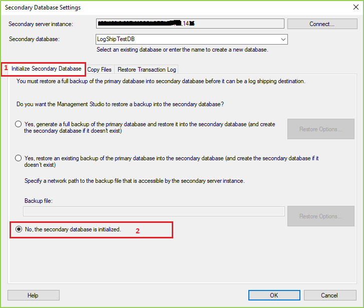 In the following image first tab, we’ll just work on the database restore/initialing process on our secondary server. You know, we’ve already restored our database in our secondary server at Step 9. So we’ll select “No, the secondary database is initialized.” Option and click OK.
