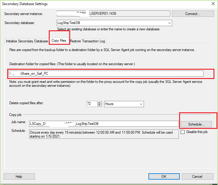 Now go to the second tab named “Copy Files”, put your secondary server shared folder network path, And click on the Schedule… button