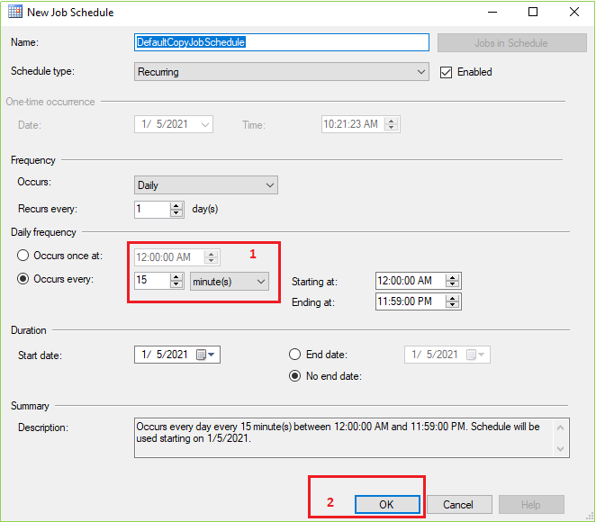 After clicking on the Schedule… from the Copy Files tab following screen will appear. Change the marked field value as your requirement and leave others as usual if it is not necessary for you. Then click OK.
