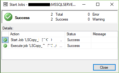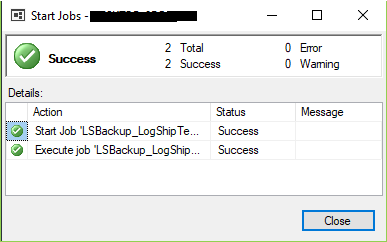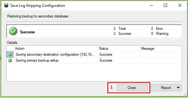 We’ve done all settings & configurations for our desired log shipping feature. When clicking OK from the previous screen then the following screen will open. If you’ve everything as our document, we hope you’ll be able to see the following screen with success a message. Click On the Close button.