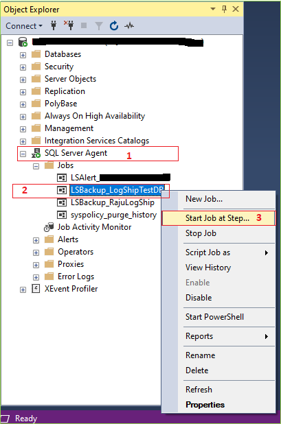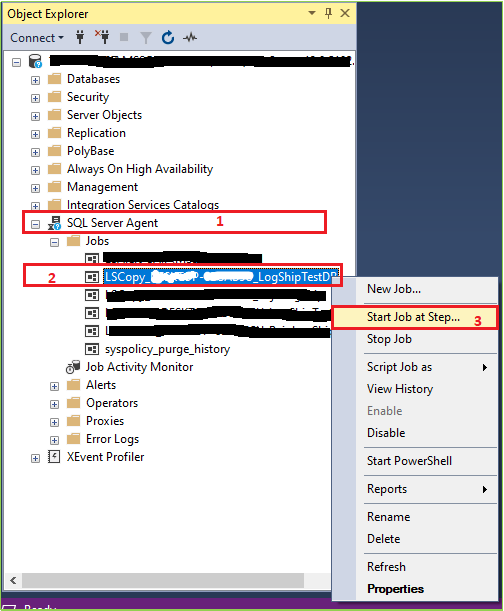 Now go to your secondary server. > Expand SQL Server Agent > Right-click on your Log Ship Copy Job > Click on Start Job at Step..