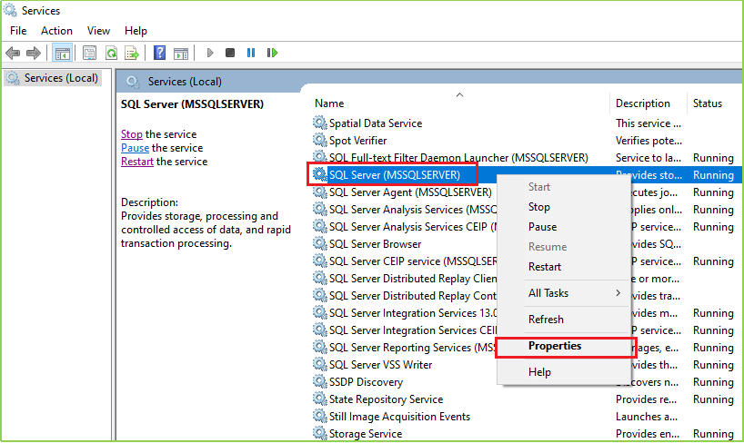 Then following window/screen will be arrived. Then Select SQL Server(MSSQLSERVER) > Right-click on that > Click On Properties as following image.