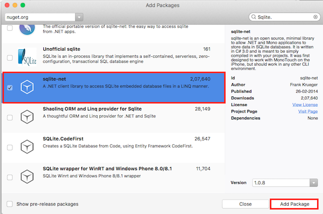 Now, choose Mobile sqlite.net crashes and select Version. Afterwards, click Add Package.