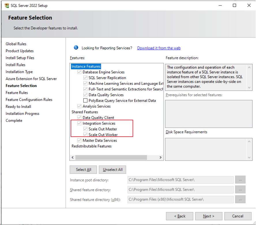 - Under Shared features, optionally select Client Tools SDK to install managed assemblies for Integration Services programming.