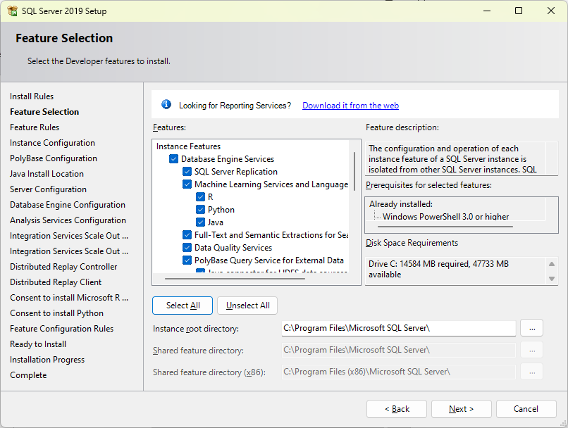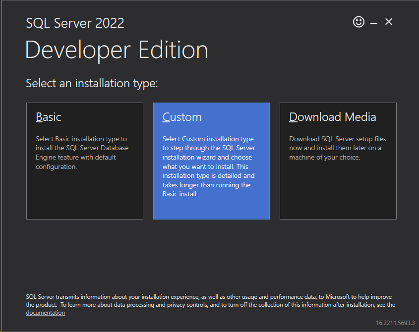 We run SQL Server inslatter to add the SQL Server Services into an existing SQL instance (Developer Edition). Choose Custom Mode: