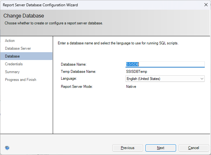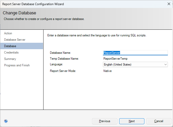- Set up Database: choose the default (SQL 2019, name as ReportServer)