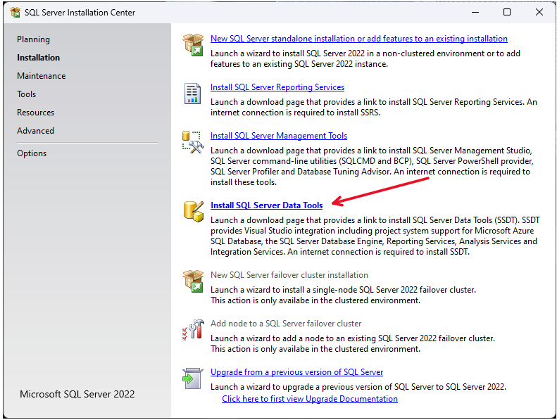 We start from the SQL Server Installer => Click Install SQL Server Data Tools