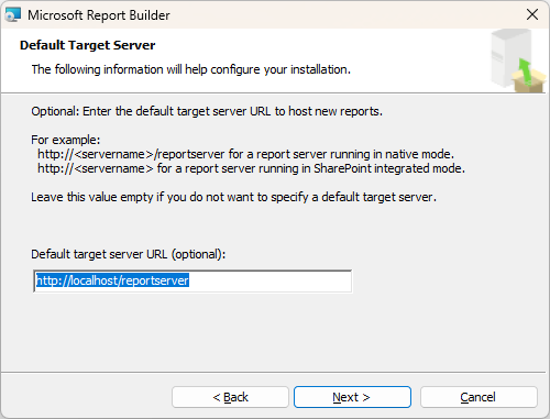 The default target server URL: http://localhost/ReportServer