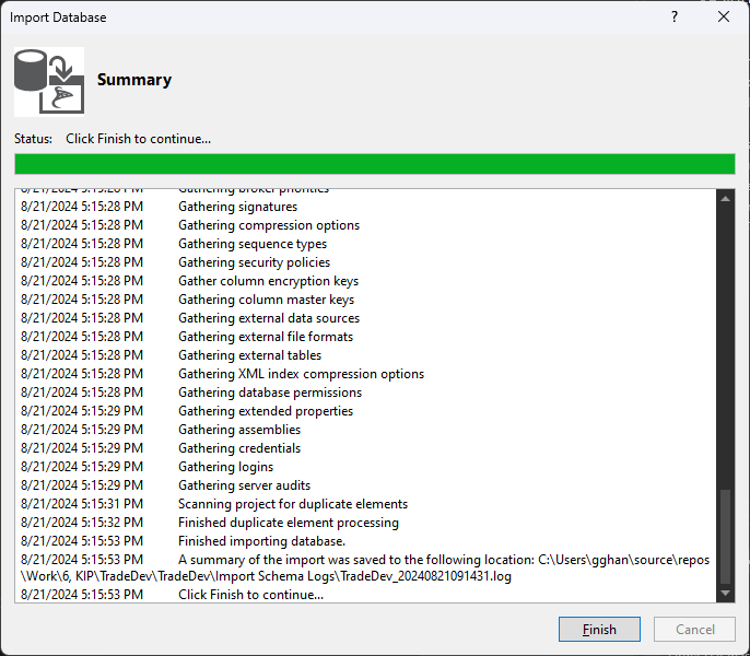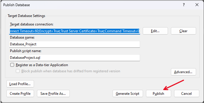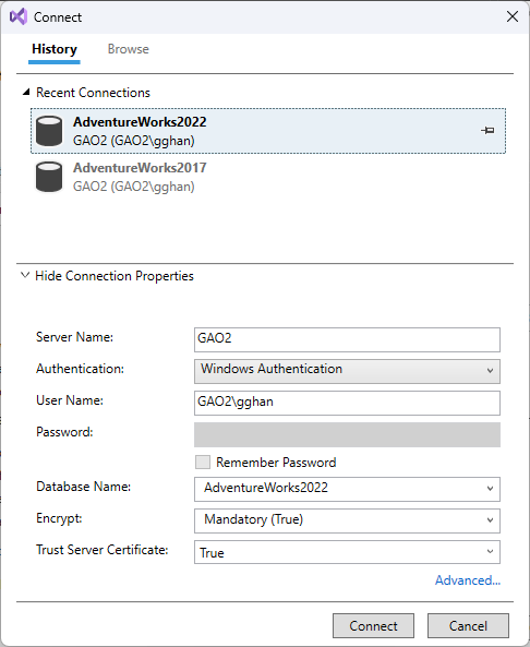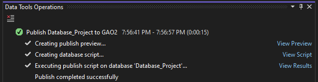 In SQL Server Object Explorer, on the upper part, AdventureWorks2022 is the SQL Server Database while on the bottom panel, Project TradeDev is what we created: