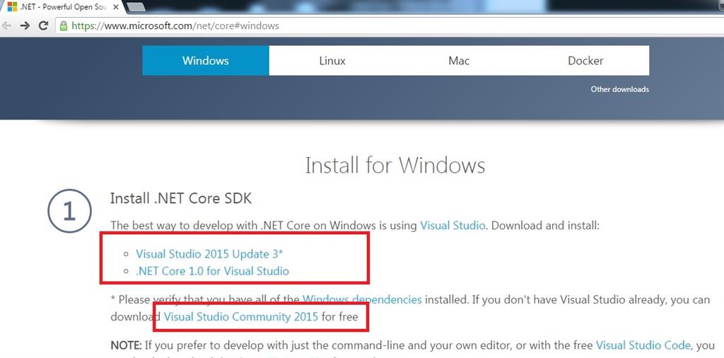 work with ASP.NET Core, download Visual Studio and .NET core from Microsoft Website, as shown in the screenshot, given below: