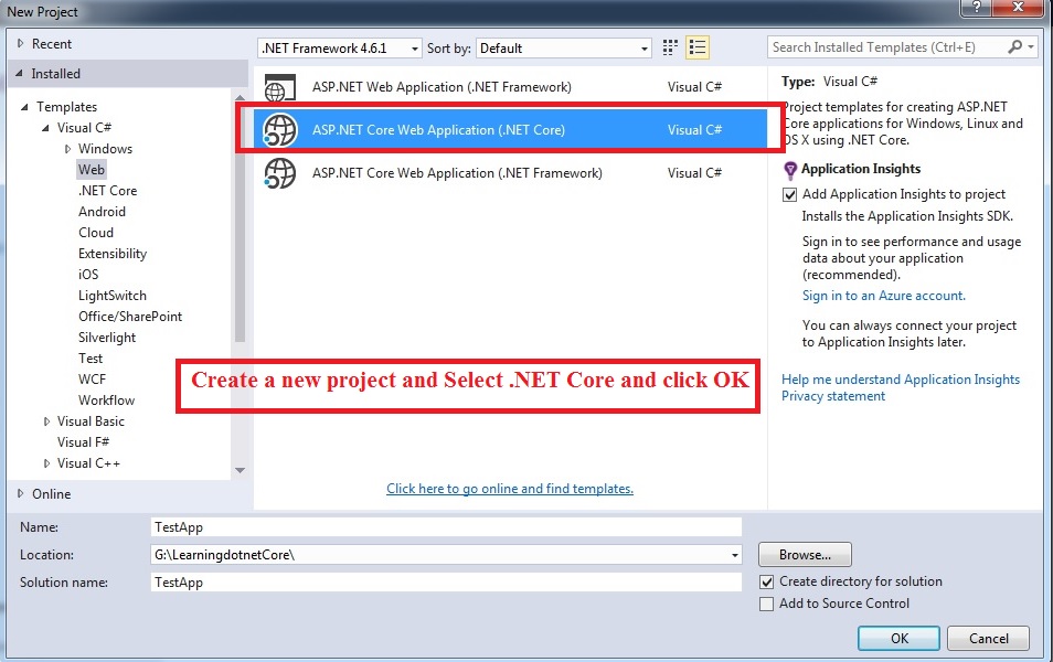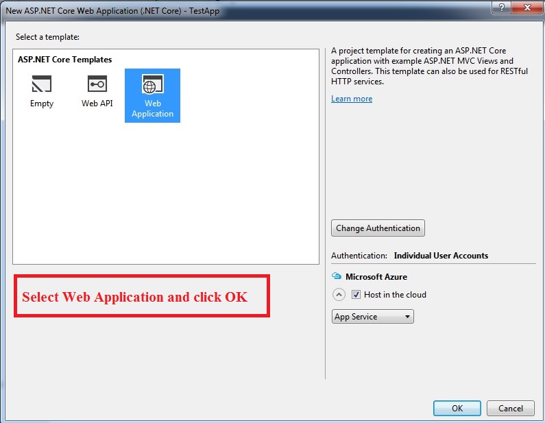 When we create a new project, select “ASP.NET Core Web Application” and click OK.