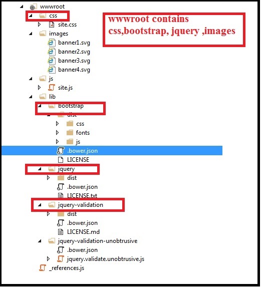 wwwroot folder contains all the css, bootstrap, jquery, images, jqueryvalidations files required for the Application.