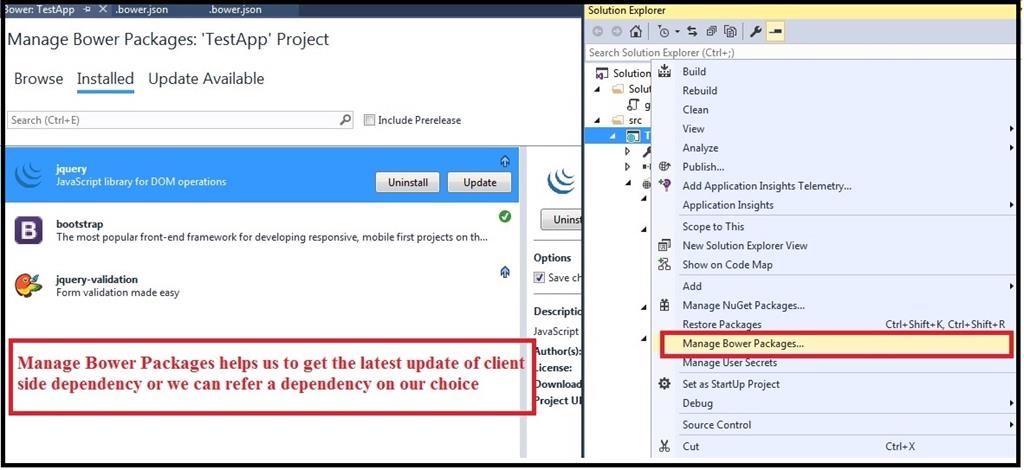 One important file to observe here is bower.json, which contains the details of the referred version of the script, styles, bootstrap versions. Microsoft recommends to get the client side dependencies from bower, using “Manage Bower Packages” option.The reason behind this is that Microsoft does not have the control of the these external component files, when these script, styles or bootstrap related new versions have come up . To update the client side dependency file, right click the Application, select the “Manage Bower Packages” option and you will get the option of updating, uninstalling,or installing the dependency, as per your choice.