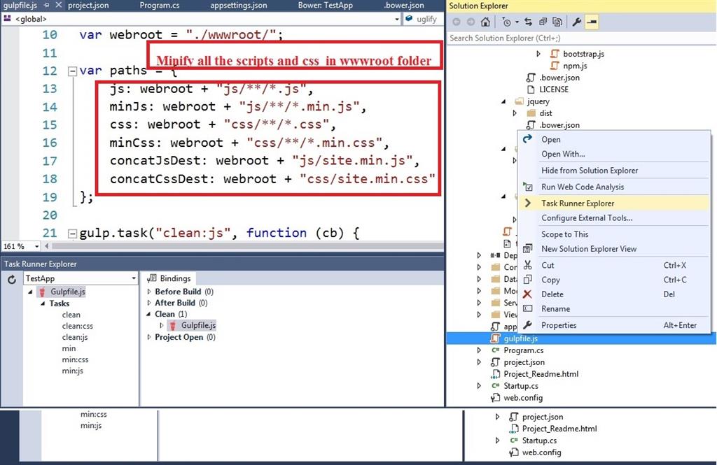 gulpfile.js provides a functionality, that allows the developers the cleaning, bundling and minification of CSS and JS files. Right click the gulpfile.js and you will be able to see the “Task Runner Explorer”, where we can minify our styles and script files.