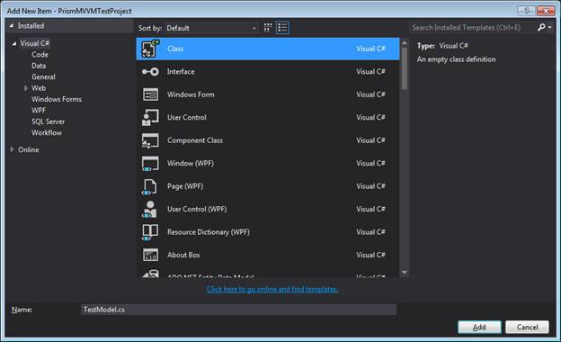 - Create a Model named ‘TestModel.xaml’ in the Models folder.