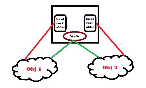 If we declare a variable as static, then that variable does not relate to any objects. That variable value will be shared among all the objects. We access the local variable via the help of objects, but in the case of static variables, we can call them through the class name, since it's common to all the objects. The object will create a memory in heap, but the static variable will not be in the heap. Instead, it will be in the class loader memory.