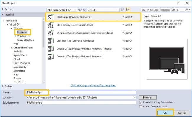 New Project window will open. There, select Installed -> Template -> Visual C# -> Windows -> Universal and select a Blank App (Universal Windows).