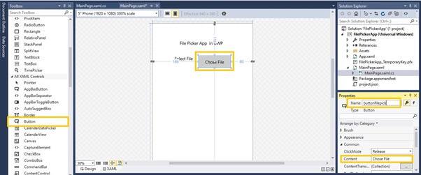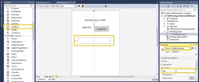 In the MainPage.xaml designing page, drag the Textblock button control from the tool box. Then, go to the Property window and change the Text as Select File.