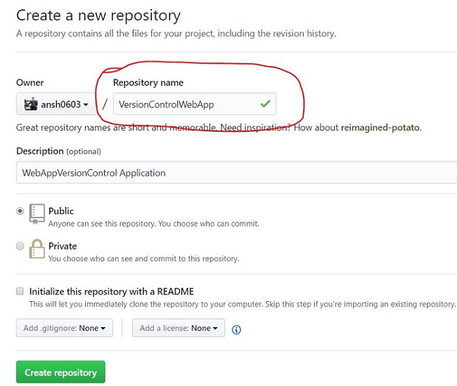 Once you start, it will ask you to create a new repository. So here, I am going to give the name 'VersionControlWebApp'. Add some sort of description.
