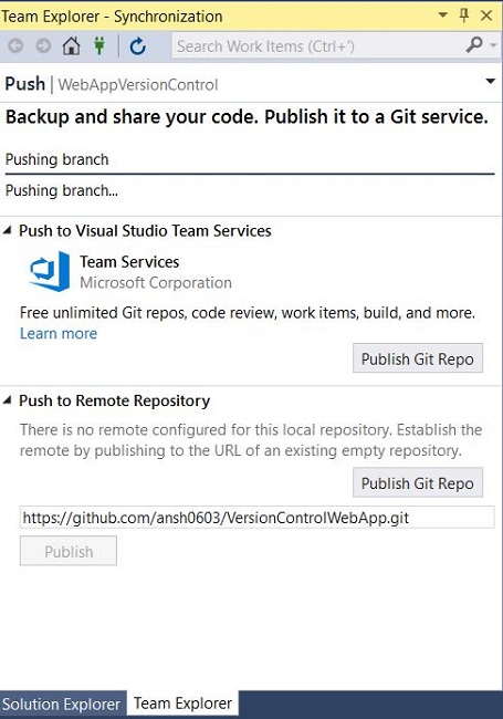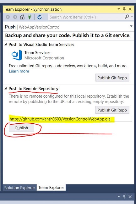 Now, from your project, open Team Explorer - Synchronization, go to 'Push to Remote Repository', and paste the URL from GitHub (shown in step 6), and click on 'Publish'.