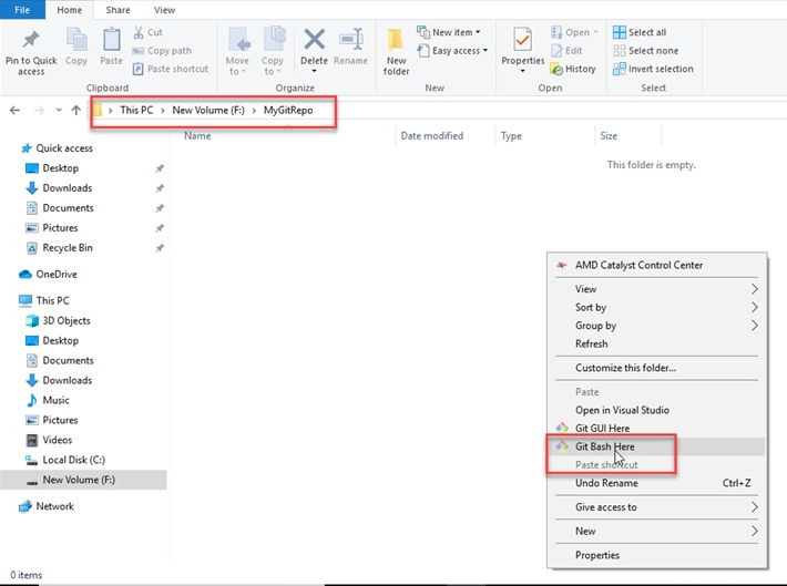 The next step is, I create a new folder called MyGitRepo on my local machine. Go to this folder right-click inside this folder and click on the Git Bash Here option as mentioned in the below image.