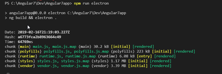 Then, we need to run the following command from our app's directory to show the output of the desktop app. Here, "ng build && electron ." means build the app, then run Electron.