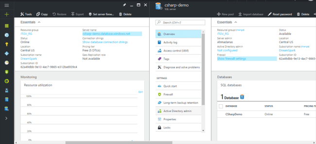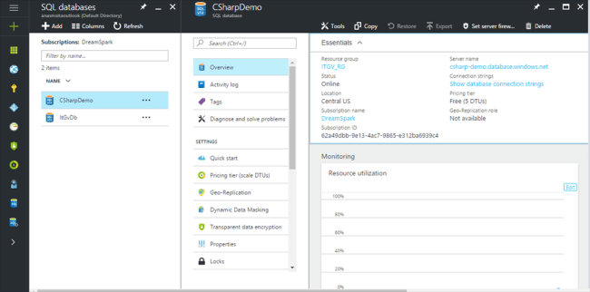 By now, we are all ready with server and database; all we need to do is to connect to SSMS. Once you click on SQL Database on left panel or refresh if it is already opened, you will find your database. Now, click on your database 'CSharpDemo' and you will find all the details in this regard.